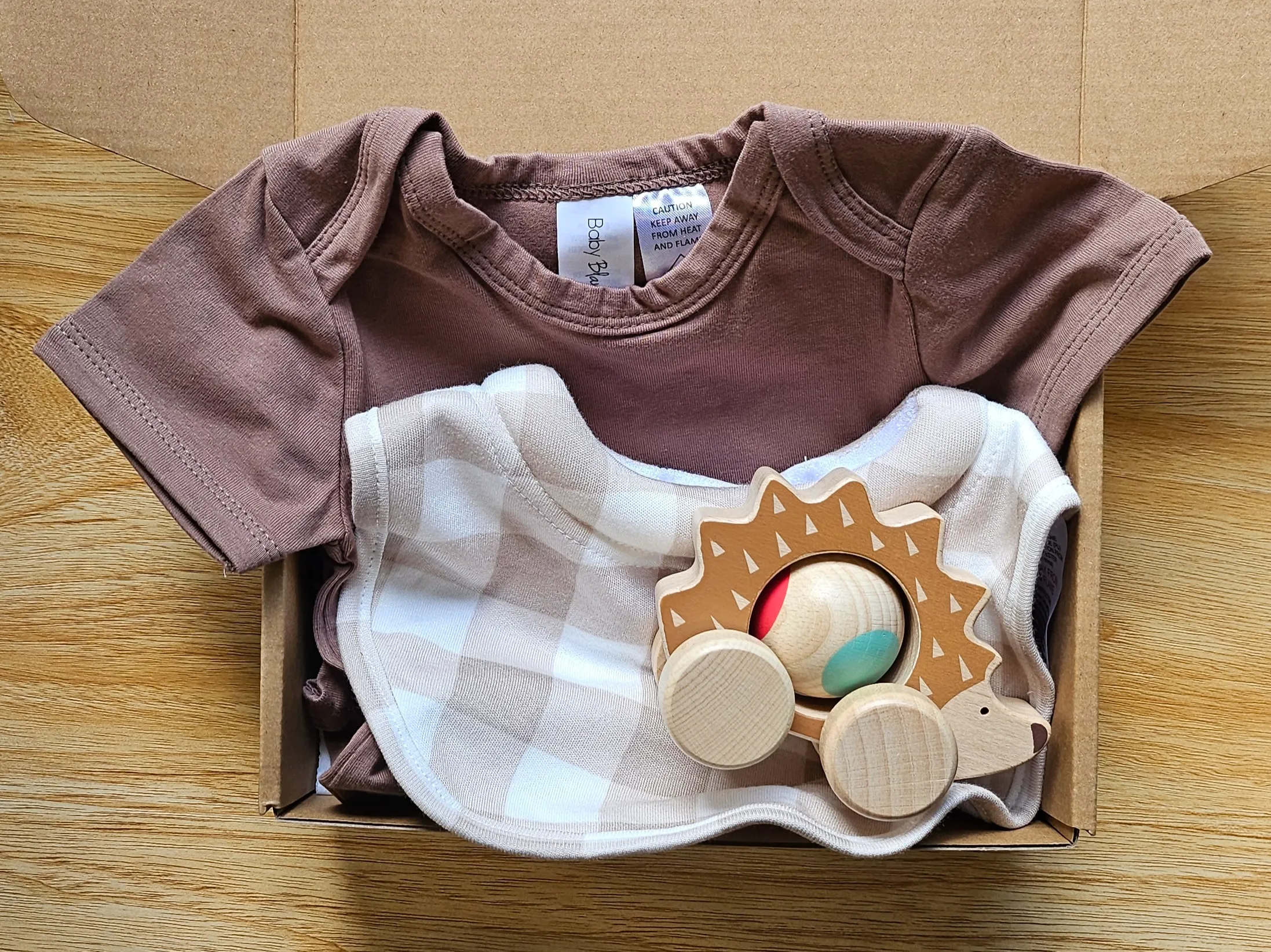 This baby gift box offers the perfect blend of practicality and cuteness. The breathable bodysuit keeps baby comfortable all day long, the bib helps with dribbles and feeding time and the wooden toy encourages sensory exploration and early motor skills.