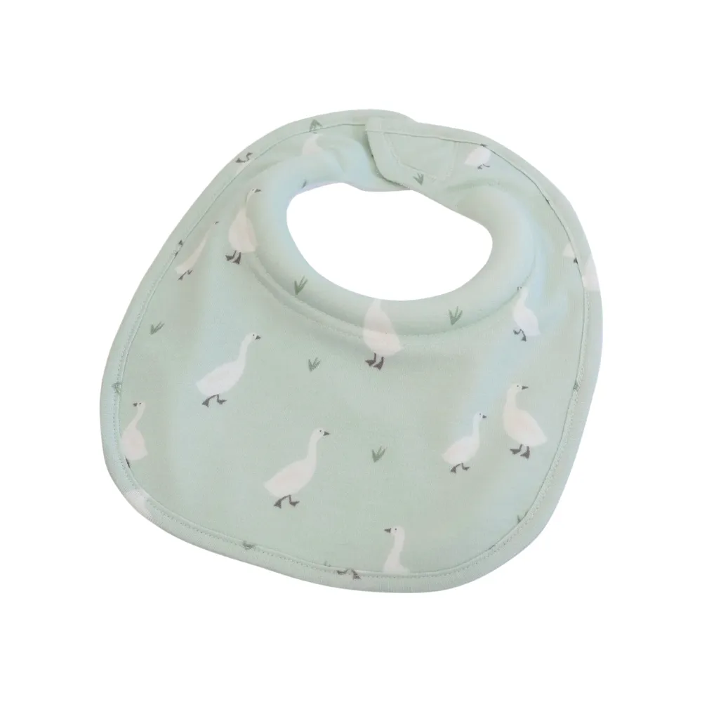 3. What are the care instructions for the organic bib? The Dribble Bib is made from high-quality, breathable fabric. We recommend a gentle machine wash in cold water with similar colors and laying it flat to dry to maintain the softness and integrity of the swan print.